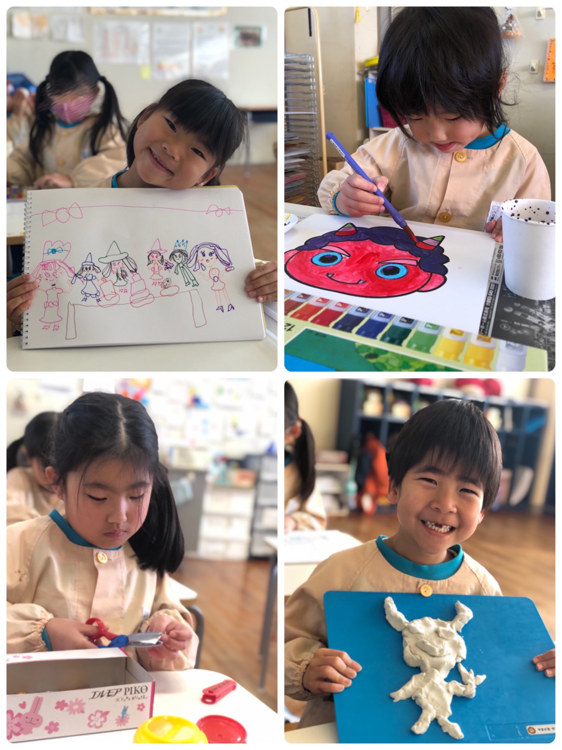 節分の日、みんなで色塗りしたお面で楽しみました。